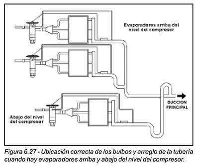 Debe asegurarse también que el tramo de la línea de succión donde va ubicado el bulbo, tenga una ligera pendiente para que haya un libre drenaje. De la misma manera, el bulbo no debe ubicarse donde exista una trampa en la línea de succión. Si el evaporador o varios evaporadores están instalados en un nivel más alto que el compresor, existen dos maneras de hacer el arreglo de la tubería, como se muestra en la figura 6.26. Si el sistema cuenta con un control de vaciado del evaporador por medio del uso de una válvula solenoide (pump down), se puede conectar la línea de succión directamente abajo del compresor, sin la trampa. Si no se cuenta con el control de vaciado, la línea de succión deberá tener una trampa después del bulbo, antes de subir verticalmente a otra trampa invertida, aproximadamente a la misma altura del evaporador. Esto es con el objeto de evitar que el refrigerante o el aceite drenen hacia el compresor por gravedad durante los ciclos de paro. Esto no evita que durante los ciclos de paro el refrigerante abandone el evaporador y se condense en el compresor, si éste o la línea de succión están a más baja temperatura.
