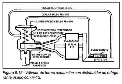 Cuando se sabe que la caída de presión a través del evaporador, está dentro de los límites definidos en la tabla 6.19, se permite instalar la conexión del igualador externo en uno de los dobleces de retorno, a la mitad del evaporador. Tal ubicación del igualador, proporcionará un control más suave de la válvula, particularmente cuando la válvula de termo expansión se usa en conjunto con un regulador de presión del evaporador. Sin embargo, en todos los casos donde se instale cualquier tipo de válvula de control en la línea de succión, la conexión del igualador externo NUNCA deberá ubicarse después de tal dispositivo, sino que deberá conectarse del lado del evaporador de esa válvula o control. Una conexión ubicada incorrectamente, interferirá seriamente con la operación eficiente de la válvula de termo expansión.