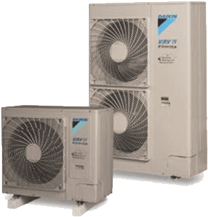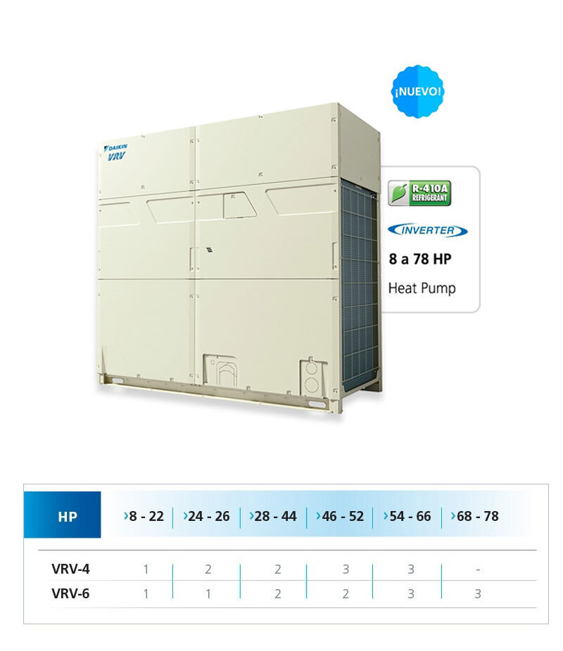 Las nuevas condensadoras Daikin VRV IV Bomba de calor funcionan en frio o en calor. Estas integran tecnología de ultima generación incrementando sus capacidades hasta los 66 HP por sistema.