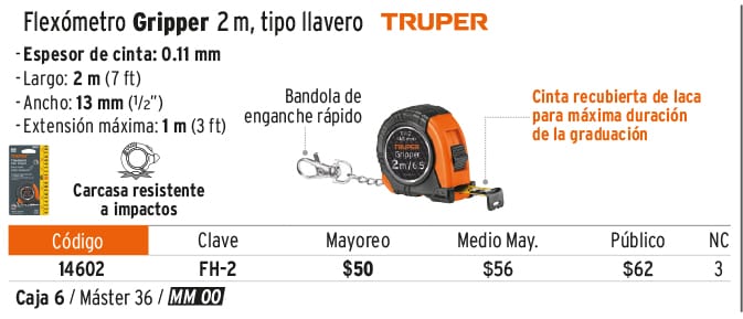Flexómetro Gripper de 2 m tipo llavero, cinta 13 mm, Truper - 14602 - FH-2 - Caja con 6 Pieza – Master 36