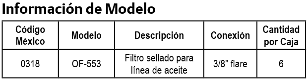 El OF-553 se ha diseñado para los equipos de refrigeración con compresores en paralelo que cuentan con un sistema externo de separación y distribución de aceite. El filtro OF-553 es de muy alta capacidad de retención de partículas solidas en suspensión. Además, es un excelente auxiliar para cualquier tipo de sistema de refrigeración simple, que cuente con una línea de retorno de aceite al compresor, a fin de mantener al sistema de refrigeración libre de contaminación.