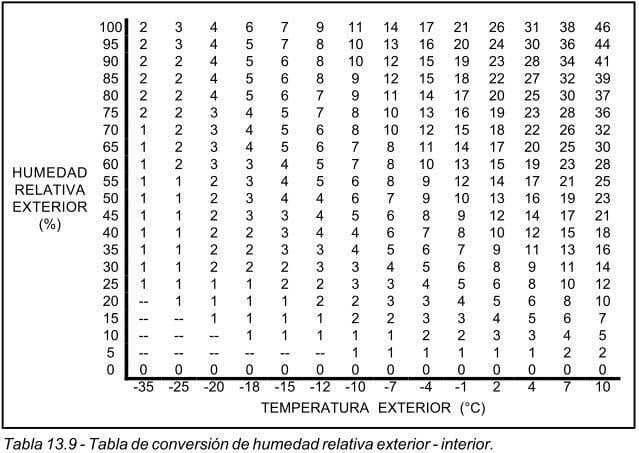 Este fenómeno es muy importante, y es lo que sucede al aire cuando se calienta. En la figura 13.9, se muestra una tabla de conversión de la humedad relativa interior-exterior, que nos ilustra cómo disminuye la hr al calentar el aire dentro de una casa o un edificio, a aproximadamente 22 o C, en base a la temperatura y hr del exterior.