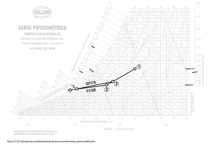 Es la eliminación simultánea de calor y humedad del aire. El enfriamiento y la deshumidificación ocurren cuando el FCSE (factor de calor sensible efectivo) y el GFCS (gran factor de calor sensible), son menores de 1.0. El FCSE para estas aplicaciones puede variar desde 0.95, cuando la carga es predominantemente sensible, hasta 0.45 cuando la carga es predominantemente latente.