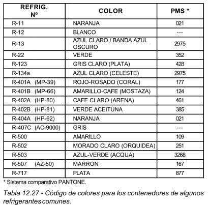 Esta codificación, permite a los técnicos y contratistas identificar rápida y fácilmente el refrigerante, por el color del contenedor, evitando mezclar accidentalmente diferentes refrigerantes en un sistema. Pero siempre se debe leer la etiqueta e identificar el contenido, antes de utilizarlo. A continuación, en la figura 12.27, se muestra una lista de los refrigerantes más populares que incluye algunos que ya están descontinuados, y también algunos de los nuevos.