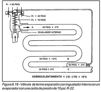 Aquí podemos ver que la presión de saturación aparece tanto sobre el diafragma (en la presión del bulbo), como debajo de éste (presión del evaporador). Y, puesto que estas presiones se oponen una contra otra y son equivalentes, se cancelan. Por lo tanto, es evidente que los dos factores que actúan para regular la válvula de termo expansión, son la presión del resorte y el sobrecalentamiento. Estos dos factores que se oponen, mantienen un delicado balance de presiones en ambos lados del diafragma, permitiendo que la válvula opere con cargas ligeras, al igual que con cargas pesadas en el evaporador. En la práctica, la válvula de termo expansión es, en efecto, un regulador del sobrecalentamiento.