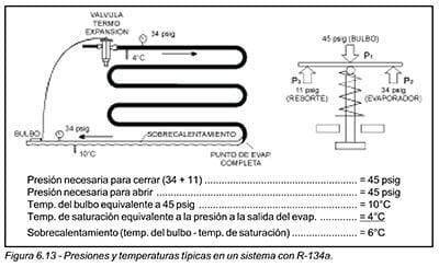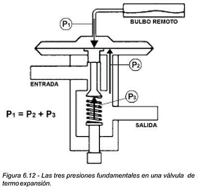 Como se mencionó arriba, la carga del bulbo está a la misma temperatura que el gas de succión, y si el gas de succión está sobrecalentado, entonces la temperatura de la carga es mayor que la de saturación; es decir, la temperatura de la carga del bulbo es la suma de la temperatura de saturación más la del sobrecalentamiento. De esta manera, la presión del bulbo (P1) es mayor que la del evaporador (P2). Si el sobrecalentamiento es lo suficientemente alto, la presión del bulbo superará a la del resorte (P3) y abrirá la válvula.