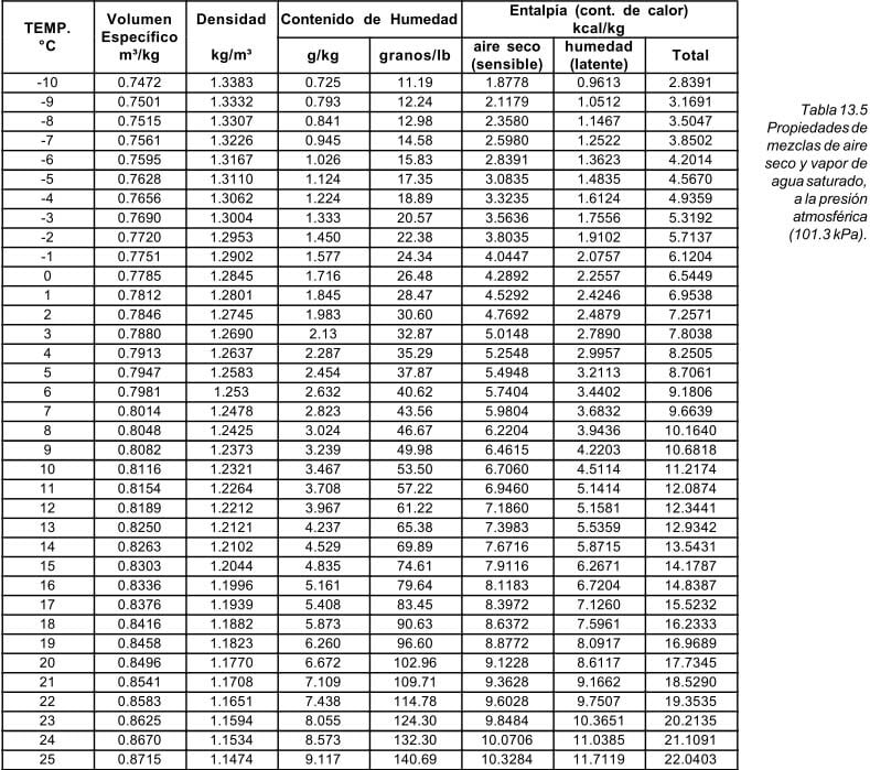 En la tabla 13.5, se muestran las propiedades de las mezclas de aire seco y vapor de agua saturado, en un rango amplio de temperaturas. Estos valores están basados en un kilogramo de aire seco saturado con humedad, a una presión total de 101.3 kPa (presión atmosférica). La primer columna corresponde, nuevamente, a la temperatura de saturación en grados centígrados. Las columnas 2 y 3 corresponden al volumen especifico en m³/kg y a la densidad en kg/m³, respectivamente, de la mezcla de aire seco y humedad.