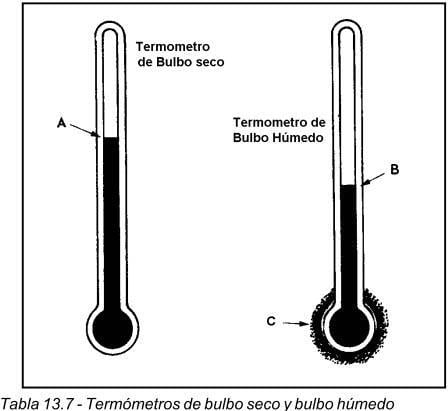 En la figura 13.7, se ilustran los termómetros de bulbo seco y bulbo húmedo. "A" representa la temperatura de bulbo seco, "B" la temperatura de bulbo húmedo y "C" la mecha que envuelve al bulbo húmedo. Nótese que la temperatura mostrada en el termómetro de bulbo húmedo, es considerablemente menor que la del termómetro de bulbo seco.