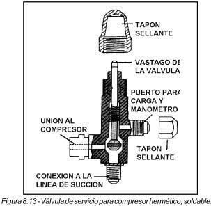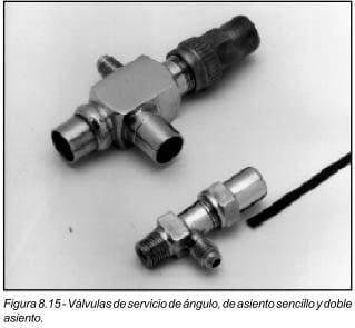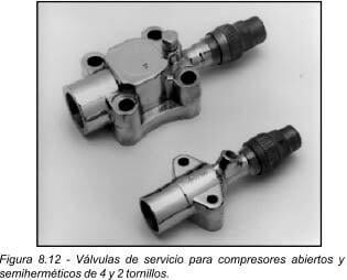 Válvulas de Servicio Para Compresor - Los compresores abiertos y semi-herméticos, generalmente vienen equipados con válvulas de servicio. Estas válvulas van atornilladas al cuerpo del compresor, una en la succión y otra en la descarga. Dependiendo del tamaño del compresor, pueden ser de dos o de cuatro tornillos. En la figura 8.12, se muestran dos válvulas típicas de servicio para compresor. Algunos compresores herméticos también usan válvulas de servicio, pero éstas no van atornilladas, sino