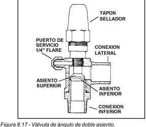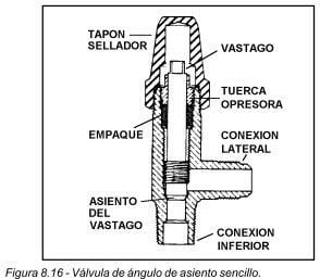 En las figuras 8.16 y 8.17, se muestran dibujos ilustrando las partes internas de una válvula de ángulo con asiento sencillo, y otra de doble asiento, respectivamente.