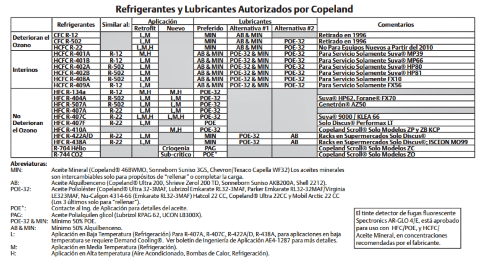 Por favor refiérase a la Forma No. 93-11R23 “Tabla de Refrigerantes /Lubricantes Aceptados por Copeland” al reverso de esta tarjeta para mayor información