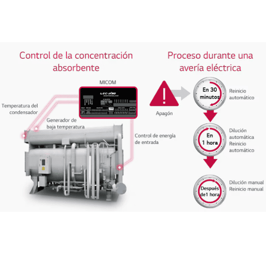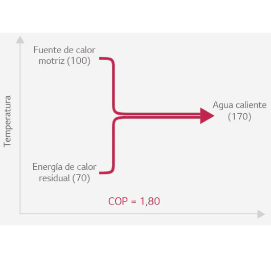 La bomba de calor de absorción de LG es un sistema altamente eficiente y económico que suministra agua caliente con una temperatura de hasta 80 °C utilizando el 70-80 % de la energía no utilizada, como fuentes de calor residual.