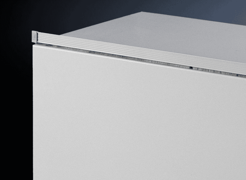 Como protección contra la acumulación de polvo entre la puerta y el perfil horizontal del armario. El listón protector ofrece espacio para la colocación de rotulación o logotipos.