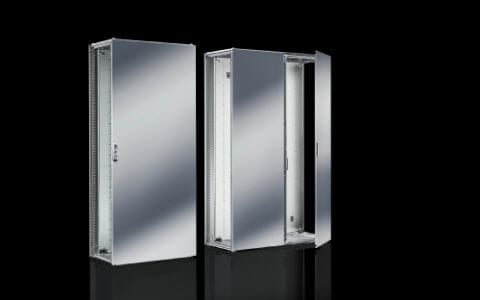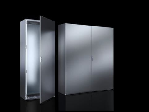 El estándar en el montaje de armarios en acero inoxidable 1.4301 (AISI 304) de alta calidad: bastidor de armario con una o dos puertas frontales, dorsal, placa de montaje, chapa de techo, chapas de suelo partidas. Adecuado para un equipamiento interior eficiente de los armarios.